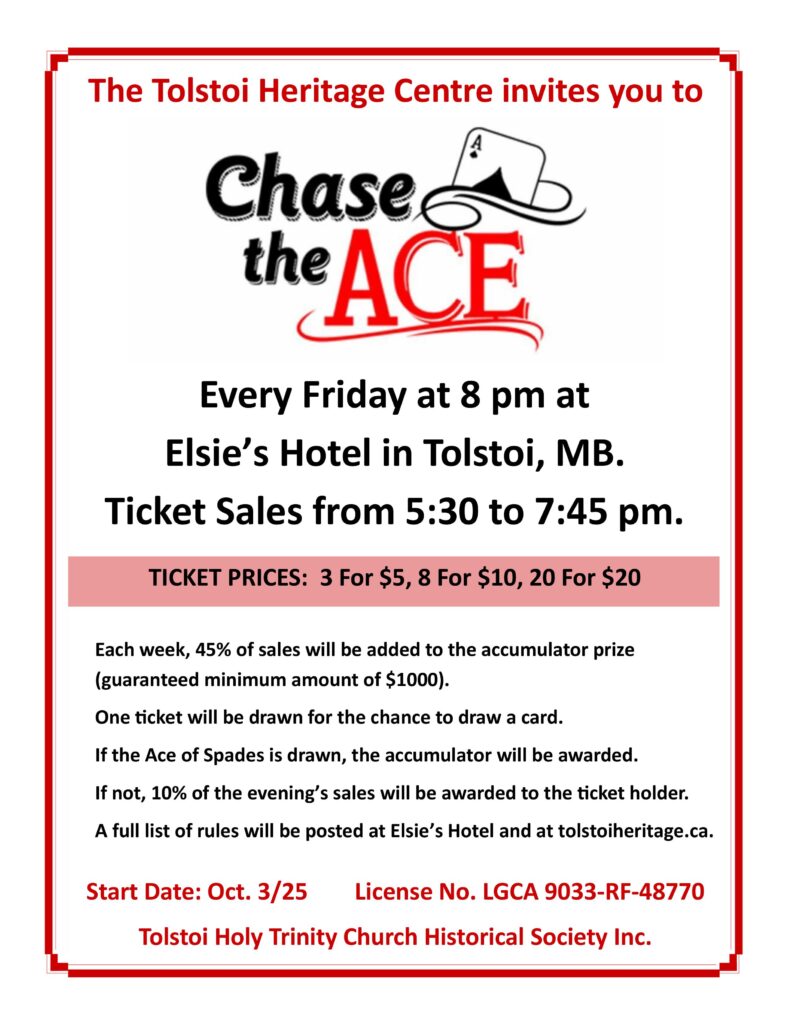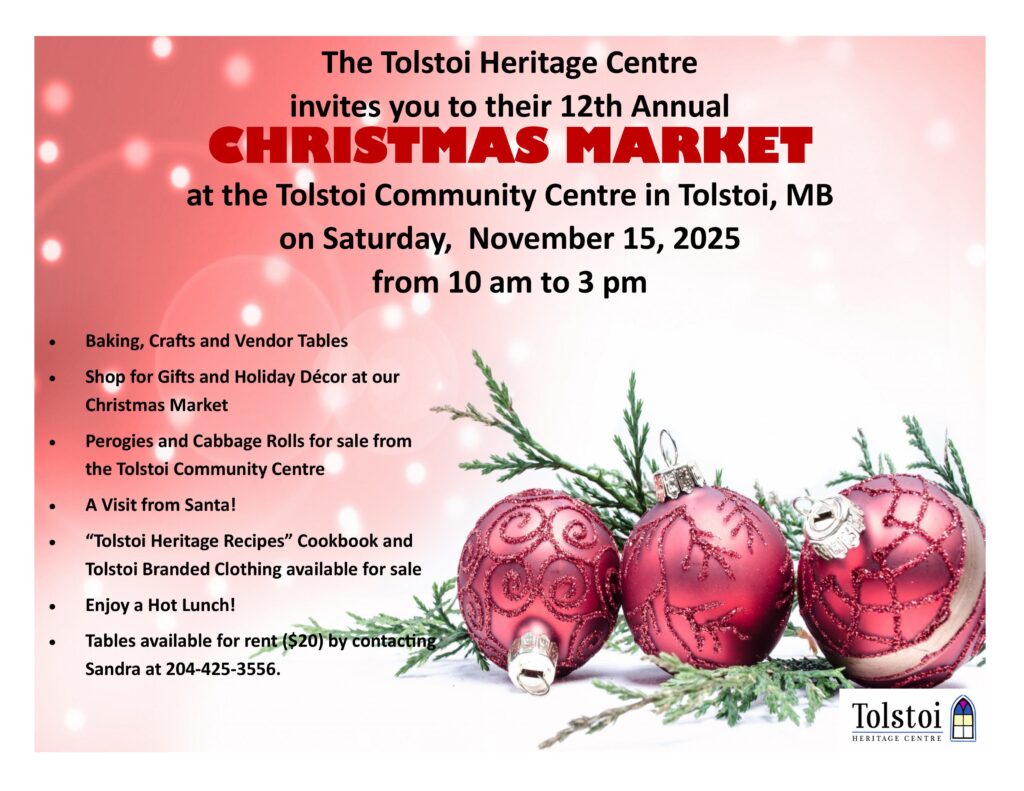 The Tolstoi Heritage Centre will be open to visitors from 11 am to 3 pm every Sunday in July and August. Ask for a tour, find out about local history, or purchase a Tolstoi Heritage Recipes cookbook or Tolstoi branded clothing. Every